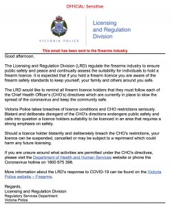 Victorian licensed firearms owners would now be aware of the recent threat by Victoria Police Licensing and Regulation Division (LRD) to ‘reprimand, suspend or cancel’ licences of registered firearm owners who ‘blatantly and deliberately breach’ the current directives of Victoria’s Chief Health Officer (CHO). SSAA Victoria considers this threat to be an overreach of powers granted to LRD.